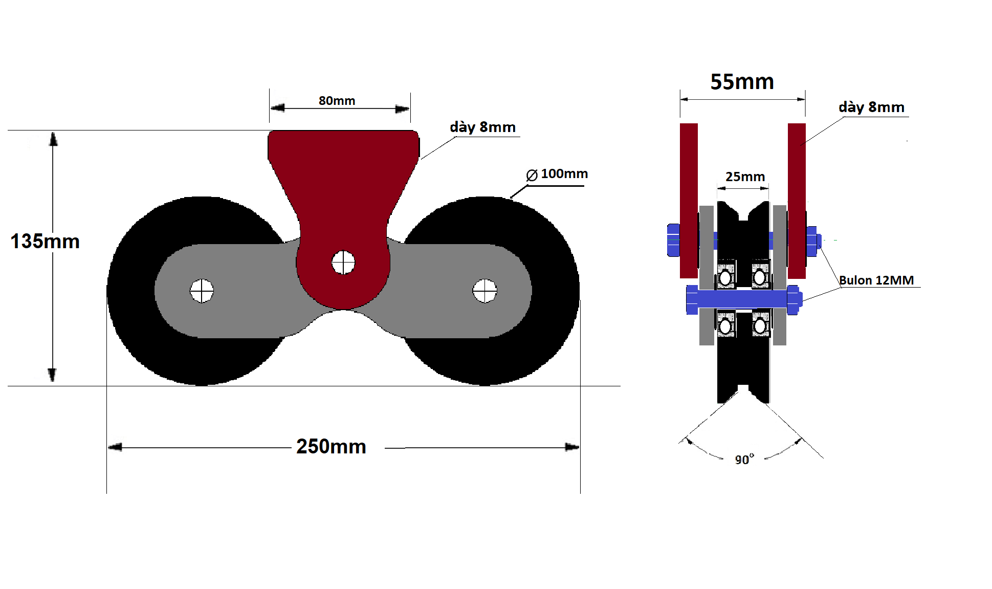 Chuyên dùng cho tấc cả các loại cửa cổng chạy trên Ray V, đặt biệt rất phù hợp cho cửa cổng siêu dài và nặng chạy trên 1 Ray V. chạy êm trên địa hình Ray không bằng phẳng, có thể leo qua vật cản mà bánh xe không bị trật khỏi đường ray, khả năng chịu tải lớn (450kg/cặp bánh)